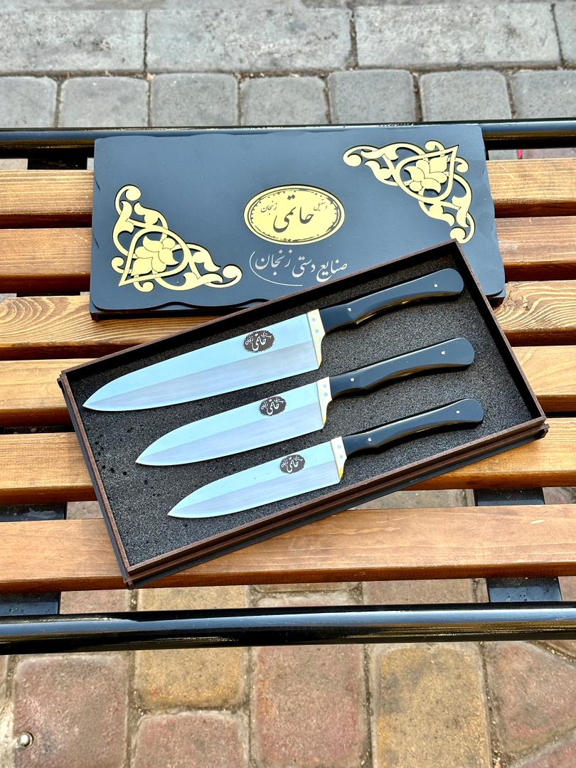ست سه تایی چاقو آشپزخانه حاتمی راسته سه سایز استیل ضد زنگ دسته فیبر نسوز با جعبه