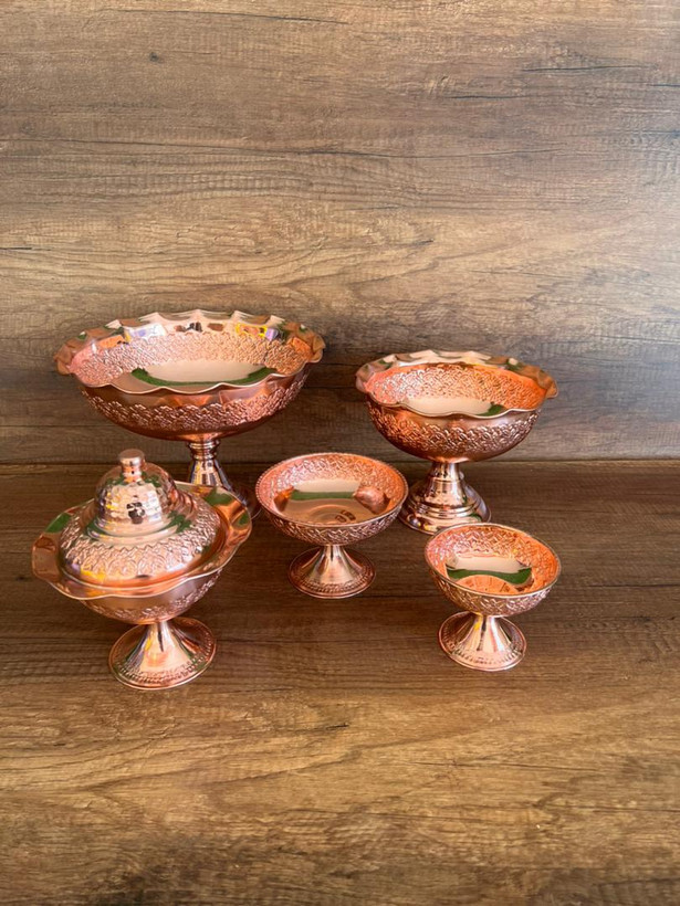 / قطر 30 سانت / قطر 25 سانت / شکلات دربدار کوچک رز مس قرمز / پیاله تک پایه رزمس قطر 11 / پیاله تک پایه رز مس قطر 15 / ست 5 تیکه